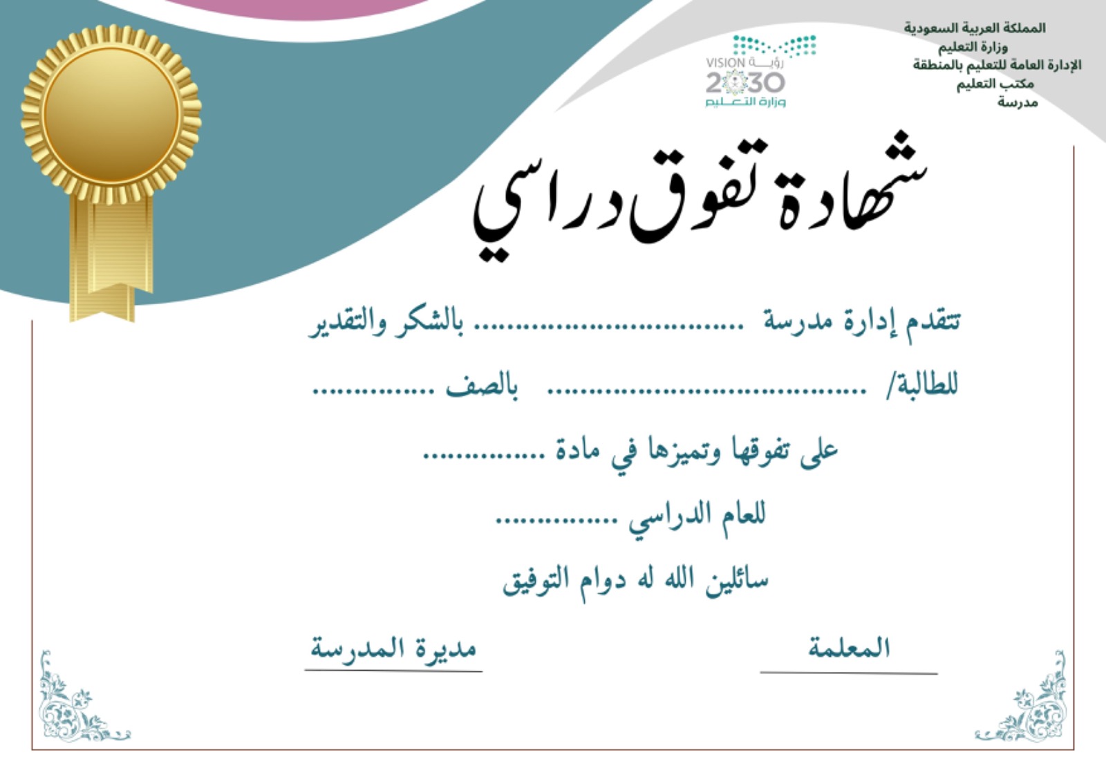 شهادة تفوق دراسي للطالبات نموذج2